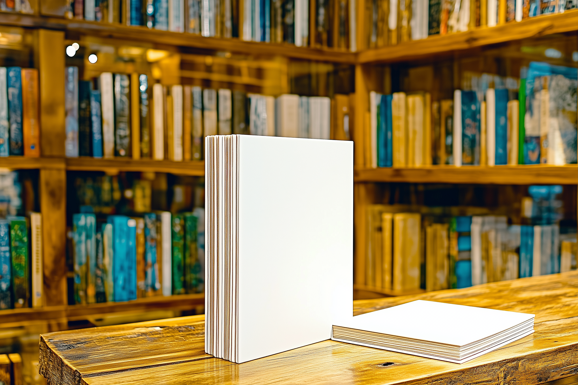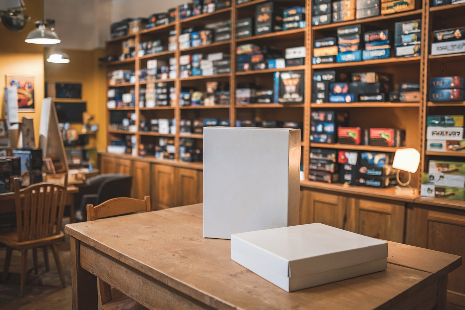 Oder wir brauchen ein Mockup, ein Laden für Brettspiele, volle Regale, bunte Verpackungen, im Vordergrund ein Tisch mit zwei unbedruckten Kartons auf die wir später das Layout unseres Games platzieren können.